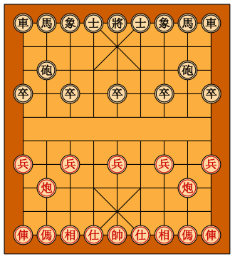 Fiqurlar yuxarıdakı diaqramda göstərildiyi vəziyyətdə başlayırlar. Hansı oyunçunun birinci başlaması tarix boyunca Çinin bir hissəsindən digər hissəsinə fərqlənib. Müxtəlif xiangqi kitabları ya qaraların, ya da qırmızıların birinci gediş etməsini tövsiyə edir. Bəzi kitablar iki tərəfi şimal və cənub kimi səciyyələndirir və bu da istiqamətləri məbələrdəki fərqlərdən asılı olaraq rəng fərqinə uyğunlaşdırır. Ümumiyyətlə isə, müasir turnirlərdə qırmızılar birinci gediş edir.