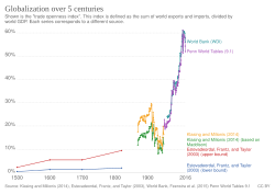 Son beş əsr üçün Ticarət Açıqlığı İndeksi. Bu indeks qlobal ixrac və idxalın cəminin qlobal ÜDM-ə bölünməsi kimi müəyyən edilir. Hər seriya müəyyən bir mənbəyə uyğundur.