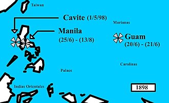 1898-ci il mayın 1 də Sakit okean eskadrası admiral Dyuninin başçılığı altında Filippinin paytaxtı Manila buxtasına soxuldu. Burada İspanlara məxsus Admiral Montexonun başçılığı altında köhnəlmiş donanma dayanmışdı. Döyüş növbətigün baş tutdu.11 ispan gəmisi məhv oldu. Dyuninin eskadrası isə demək olar ki, itkiyə düçar olmamışdı. Yalnız heyətdən 7 nəfər yaralanmışdı. İspanların itkiləri isə 381 nəfər ölü və yaralılar idi. Nəticədə Amerinkanlar Filippin arxipelaqının bütün ərazisində dəniz kommunikasiyaları üzərində nəzarəti ələ almışdılar. Elə bu anda Filippin Milli ordusu Manilanı mühasirəyə aldı. Buradakı ispan qarnizonun vəziyyəti çıxılmaz olmuşdur.