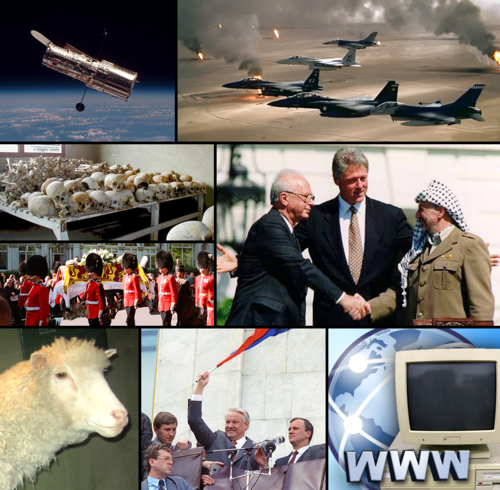 Soldan, saat əqrəbi istiqamətində: 1990-cı ildə Habbl teleskopunun kosmosda uçuşu; 1991-ci ildə ABŞ-a məxsus qırıcılar Körfəz müharibəsində; 1993-cü ildə Oslo anlaşması; Dünyada bu onillikdə Ümumdünya hörümçək torunun populyarlığı çox artımışdı; Sovet İttifaqının dağılması; Dolli dünyada ilk klonlaşdırılan canlı olmuşdur; 1997-ci ildə Şahzadə Diananın cənazəsi; 1994-cü ildə Ruanda soyqırımı