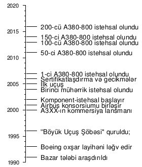 1994-cü ilin iyun ayında, Airbus, A3XX adlı yeni bir təyyarə istehsal etməyi planladığını açıqladı. Airbus, A340-dan böyük olan bu təyyarədə bir sıra dizaynları nəzərdən keçirmişdir. A3XX, VLCT araşdırmasına və Boeing-in öz NLA-sının 747-yə varisliyinə qarşı çıxdı. 1997-2000-ci illərdə Şərqi Asiyadakı maliyyə böhranı bazarının dünyagörüşünü qaranlıqlaşdıran Airbus, Boeing-in 747-400-dən əməliyyat xərclərinin 15-20% az olacağını hədəfləyərək dizaynını yaxşılaşdırdı. A3XX dizaynı ənənəvi vahid təyyarə dizaynına nisbətən daha çox sərnişin həcmini təmin edən iki mərtəbə üzərində inşa edilib. Boeing 777 ilə nöqtədən-nöqtəyə nəzəriyyələrinə qarşı ənənəvi qovşaq və danışan nəzəriyyələrinə uyğun olaraq, 200-dən çox fokus qrupu ilə geniş bazar analizi aparılmışdır. Böyük bir hissəsinin erkən marketinqi təyyarədə dükanların, restoran kimi yeməkxanaların, idman zallarının, qumarxanaların və gözəllik salonlarının olması ehtimalını nəzərdə tutsa da, aviaşirkətlərin iqtisadiyyatının reallıqları belə arzuları əsaslandırırdı.