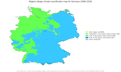 Şərq bölgələrində iqlim nisbətən quru olur. Ölkənin mərkəzi və qərb bölgələrində isə dəniz iqlimi və kontinental iqlim müxtəliflik göstərir. Almaniyanın əksər hissələrində dəniz iqlimi və kontinental iqlimin hakim olmasına baxmayaraq, ucqar cənubda Alp dağlarında isə daha aşağı temperatur və daha artıq atmosfer yağıntıları müşahidə olunur.