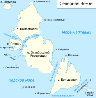 Arkiçeski burnu Kara dənizi ilə Laptevlər dənizi arasında sərhəddin başlanğıcını təşkil edir. Asiya qitəsinin adada yerləşən ucqar şimal nöqtəsidir.