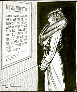 1930-cu ildə Kanadada nəşr olunan bir karikatura: Kvebek əyalətindən bir qadın, türk qadınının səs vermək hüququna malik olduğunu öyrənir. Kvebekli qadınlar 25 aprel 1940-cı ildə səs verməyə haqq qazandı.