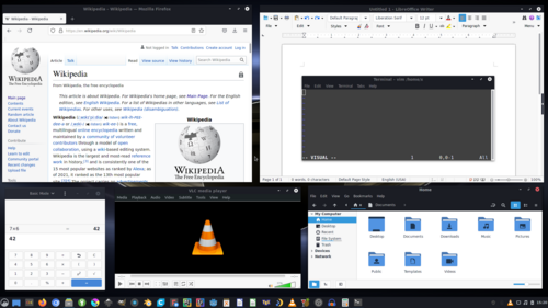 Cinnamon iş masası mühitində işləyən Manjaronun ekran görüntüsü. MediaWiki əsaslı Vikipediyaya daxil olmaq üçün istifadə olunan Firefox, LibreOffice Writer, Vim, GNOME Calculator, VLC və Nemo fayl meneceri də daxil olmaqla şəkildəki hər şey açıq mənbəlidir.