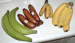 Biz ağ, yumşaq və dadlı özəyi, sarı qabığı olan banana adət etmişik, Amma onun həm də çəhrayı, qırmızımtıl, bənövşəyi və qara qabıqlıları da var. Bu növlər çox zərifdir və daşınmaya davam gətirmir. Meyvənin ölçüləri də müxtəlifdir və nisbətən kiçikölçülü olan "cırtdan" banan çox dadlı sayılır.