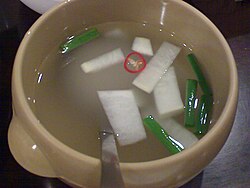 - Cangcorim – soya sousu əlavə edilmiş mal əti bulyonu; istəyə uyğun olaraq bişmiş yumurta və ya bildirçin yumurtası da əlavə edilə bilər.