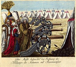 Barıtlı silah əldə edən üç imperiyadan birincisi Osmanlı İmperiyası olmuşdur. 14-cü əsrdə Osmanlılar barıt artilleriyasını mənimsəmişdilər. Osmanlılar tərəfindən barıt silahlarının qəbulu o qədər sürətli oldu ki, onlar "odlu silahların istehsalı və idarə edilməsində ixtisaslaşmış mərkəzləşdirilmiş və daimi qoşunların yaradılmasında həm Avropalı, həm də Yaxın Şərqdəki rəqiblərini qabaqladılar". Lakin, bu onların rəqiblərini şoka saldı və digər iki İslam imperiyasını silah proqramlarını sürətləndirməyə sövq etdi. Osmanlılar ən azından artıq I Bayazidin dövründə artilleriyaya sahib idilər və onlardan 1399 və 1402-ci illərdə Konstantinopolun mühasirələrində ondan istifadə etdilər. Onlar nəhayət 1430-cu ildə Salonikanın müvəffəqiyyətli mühasirəsində mühasirə mühərrikləri kimi öz silahlarını sübut etdilər. Osmanlılar toplarını tökmək üçün Yaxın Şərq və Avropa tökmə zavodlarından istifadə etdilər və 1453-cü ildə Konstantinopolun mühasirəsi zamanı onların şəhərin divarlarını dağıtmaq üçün kifayət qədər böyük topları var idi ki, bu da müdafiəçiləri təəccübləndirmişdi.