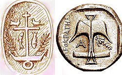 | Qələbənin rəmzi olan Yunan xaçı. Yuxarıda olan hərflər yunanca "İsa" və "Xristos" sözlərinin baş hərfləridir. Aşağıda isə "NİKA" (qalib) sözü yazılmışdır. | ![]() |
