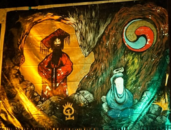 Sonqşan Şaolinsi monastırının içərisində daşdan oyulmuş barelyef var, əllərində monastır sandal tutan Bodhidharmanın ayaqyalın qərbə doğru getdiyini təsvir edir.