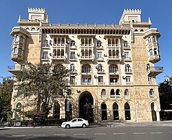 Bina U-şəkilli və beş mərtəbəli bir evdir. Evin qarşısında Nəsimi meydanı yerləşir. Evin üzərində bir-birlərinə simmetrik olan iki qüllə var. Bu qüllələr taca bənzəyir və belvederdirlər. Memar Rəna Əfəndizadənin sözlərinə görə, mənzilin fasadları plastik maddələrdən hazırlanıb və memar Aleksandr Ryabuşinin qeyd etdiyi kimi, mənzilin fasadında istifadə edilən maddələr çox bahalı və keyfiyyətli idi. Binanın cənuba doğru baxan hissəsində çoxlu pəncərələr və balkonlar var. Ryabuşin dizaynerlərin binadakı pəncərələrin dizaynında Mərakeş memarlığından ilhamlandığını etiraf etmişdir.