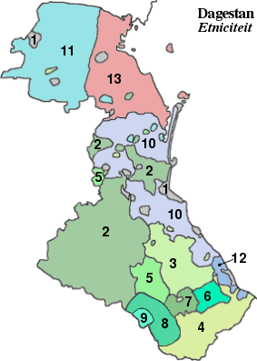 1-Qarışıq , 2-Avarlar, 3-Dargilər, 4-Ləzgilər, 5-Laklar, 6-Tabasaranlılar, 7-Ağullar, 8-Rutullar, 9-Saxurlar, 10-Qumuqlar, 11-Noqaylar, 12-Azərbaycanlılar, 13-Ruslar