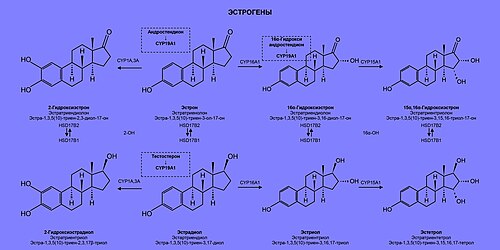 İnsanda üç növ estrogen var: estradiol, estriol və estron. Bədəndə androgenlərin mürəkkəb fermentativ reaksiyası nəticəsində əmələ gəlir: estradiol testosterondan, estron isə aromataza fermentinin təsiri altında androstenediondan əmələ gəlir.