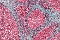 Qaraciyər sirozunu göstərən mikroqraf. Bu nümunədəki toxuma fibrozun mavi rəngdə olduğu trixrom ləkəsi ilə boyanmışdır. Qırmızı sahələr düyünlü qaraciyər toxumasıdır.
