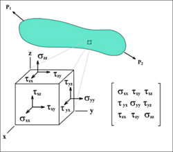 S = [ σ x τ x y τ x z τ y x σ y τ y z τ z x τ z y σ z ] {\displaystyle S={\begin{bmatrix}\sigma _{x}&\tau _{xy}&\tau _{xz}\\\tau _{yx}&\sigma _{y}&\tau _{yz}\\\tau _{zx}&\tau _{zy}&\sigma _{z}\end{bmatrix}}} {\displaystyle S={\begin{bmatrix}\sigma _{x}&\tau _{xy}&\tau _{xz}\\\tau _{yx}&\sigma _{y}&\tau _{yz}\\\tau _{zx}&\tau _{zy}&\sigma _{z}\end{bmatrix}}}