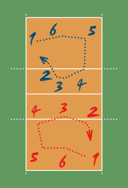 Bir oyunçu topa öz meydançasında toxunaraq hər hansı bir yüksəklikdən zərbə vuraraq hücum vuruşunu tamamlaya bilər. Arxa zona oyunçusu da ön zonanın gerisindən hər hansı bir yüksəklikdən hücum vuruşunu tamamlaya bilər. Bu zaman oyunçu tullanarkən ayağı ön zona xəttinə dəyməməli və ya o xətti keçməməlidir, ancaq zərbəni vurub qurtardıqdan sonra sıçrayış zamanı xətti keçə bilər. Top ön zonada ikən heç bir oyunçunun rəqibin servisinə qarşı hücum vuruşu tamamlamasına icazə verilmir.