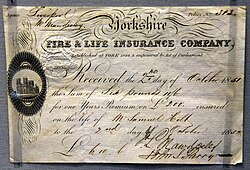 Yorkshire Fire & Life Insurance Company tərəfindən Samuel Holta verilmiş Həyat Sığortası Sertifikatı, Liverpul, İngiltərə, 1851. Britaniya Muzeyində, Londonda nümayiş olunur.