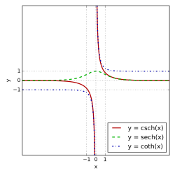 csch x = ( sinh ⁡ x ) − 1 = 2 e x − e − x = 2 e x e 2 x − 1 {\displaystyle \operatorname {csch} \,x=\left(\sinh x\right)^{-1}={\frac {2}{e^{x}-e^{-x}}}={\frac {2e^{x}}{e^{2x}-1}}} {\displaystyle \operatorname {csch} \,x=\left(\sinh x\right)^{-1}={\frac {2}{e^{x}-e^{-x}}}={\frac {2e^{x}}{e^{2x}-1}}}