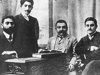 Hümmət Partiyasının yaradıcıları. Soldan sağa: Məşədi Əzizbəyov, Əjdər Məlikov, Əsədulla Axundov və Məhəmməd Əmin Rəsulzadə
