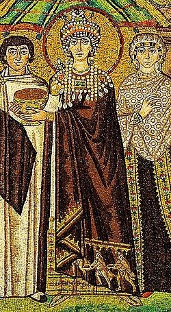 Məryəmin uşaq İsanı qucağında tutduğunu təsvir edən, Ayasofiya mozaikası.Sağ tərəfində Yustinian durur və Ayasofiyanın maketini təqdim edir. Onun solunda I Konstantin Konstantinopolun maketini təqdim edir.