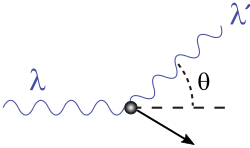 Kompton effekti üçün təsvir. Dalğa boyu olan λ {\displaystyle \lambda } {\displaystyle \lambda } radiasiya soldan sağa doğru yönəldilir. Bir elektronla əlaqə qurduqdan sonra, λ ′ , {\displaystyle \lambda ',} {\displaystyle \lambda ',} dalğa uzunluğunu bir istiqamətə görə orijinal istiqamətə   θ {\displaystyle \ \theta } {\displaystyle \ \theta } nisbətlə dəyişir. Ox, fotonun qarşılıqlı olduğu elektronun hərəkət istiqamətini göstərir.