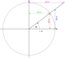 Kotangens — qonşu katetin qarşı katetə olan nisbətinə deyilir. İfadəsi: cot ⁡ α = | A B | | B C | = 1 tan ⁡ α = cos ⁡ α sin ⁡ α {\displaystyle \cot \alpha ={\frac {|AB|}{|BC|}}={\frac {1}{\tan \alpha }}={\frac {\cos \alpha }{\sin \alpha }}} {\displaystyle \cot \alpha ={\frac {|AB|}{|BC|}}={\frac {1}{\tan \alpha }}={\frac {\cos \alpha }{\sin \alpha }}}