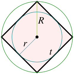 • Tutaq ki, kvadratın tərəfi t {\displaystyle t} {\displaystyle t}, xaricinə çəkilmiş çevrənin radiusu R {\displaystyle R} {\displaystyle R}, daxilinə çəkilmiş çevrənin radiusu isə r {\displaystyle r} {\displaystyle r}-dir.