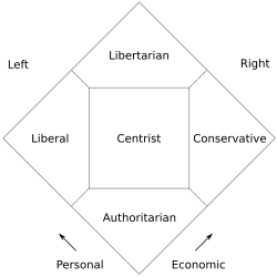 1970-ci ildə amerikalı libertar David Nolan tərəfindən təklif edilən Nolan diaqramı onun libertarizmin hökumətin cəmiyyətə müdaxiləsini məhdudlaşdırmaqla həm iqtisadi, həm də şəxsi azadlığı təşviq etdiyi iddiasını nümayiş etdirməyə xidmət edir. Nolanın fikrincə, bu, yalnız "şəxsi azadlıqları" müdafiə edən solçu "liberalizm", yalnız "iqtisadi azadlıqları" müdafiə edən sağçı "mühafizəkarlıq", eləcə də tərəfdarları ciddi şəkildə mübarizə aparan populist "avtoritarizm" ilə ziddiyyət təşkil edir. cəmiyyətin həyatına dövlət nəzarəti və gəlirlərin varlılardan yoxsullara yenidən bölüşdürülməsi.