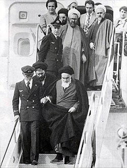 Ruhullah Xomeyninin 14 illik sürgündən sonra İrana geri qayıtması. Arxada Mürtəza Mütəhhəri (1 fevral 1979, Mehrabad hava limanı, Tehran, İran)