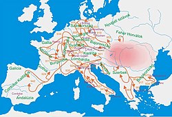 X əsrdə macarların Avropaya gəlişi, qırmızı işarə macarların ərazisidir.