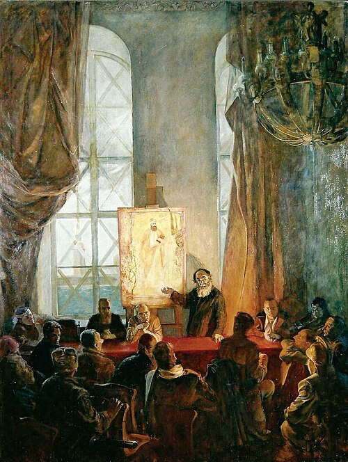 Rəssam əsəri işləməmişdən əvvəl təsvir edəcəyi tarixi hadisə ilə bağlı kifayət qədər material toplaya bilmişdi. Bu da ona yubiley mərasimini bütün reallığı ilə göz önündə canlandırmağa imkan verib. Rəssam əvvəlcə tədbirin keçirildiyi yerlə (Ermitaj) tanış olub. Hətta meteoroloji mərkəzindən öyrənib ki, yubiley günü Leninqradda müsbət 1 dərəcə olub, gecə saat 1-də qar yağmağa başlayıb.
