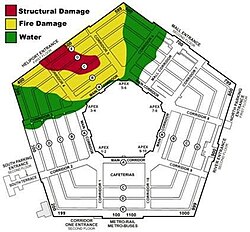 2001-ci il sentyabrın 11-də rəsmi məlumatlara əsasən, saat 9:37:46-da təyyarə Pentaqonun sol qanadına çırpılıb. Orada Hərbi Dəniz Qüvvələri komandanlığı yerləşib. Binanın bir hissəsi dağılıb və ciddi zədələnib. Maraqlıdır ki, zərbə anında Pentaqonun məhz bu qanadı yenidən planlaşdırmadan keçib və əməkdaşların əksəriyyəti digər kabinetlərə köçürülüb.