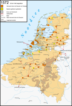 Ölkədə vəziyyət getdikcə gərginləşirdi. Hersoq Alba, öz "uğurlarından" ruhlanaraq, son tədbirə əl atdı — 1572-ci ilin yazında — əlkabala kimi tanınan, daimi ispan vergisini tətbiq etdi. Əlkabalanın tətbiq olunması təhdidi ölkənin iqtisadi həyatını iflic etdi. Qiymətlər dərhal artdı. Manufakturalar, dükanlar, emalatxanalar bağlanmağa başladı. Şimalın bəzi şəhərləri əlkabalanın tətbiqinə qarşı müqavimət göstərdilər. Müqaviməti qırmaq üçün Alba, sahilboyunun müdafiyəsini zəiflətmək məcburiyyətində qalıb, bu şəhərlərə ispan qoşunlarını yerləşdirdi. Nəhayət o əlkabalanı ləğv edib, birdəfəlik vergi ilə kifayətləndi. Lakin onun sonradan tətbiqi təhdidi qalırdı. Sahilboyunun müdafiyəsinin zəifləməsindən "dəniz qözlari" istifadə etdi. İngiltərə limanlarına son vaxtlara qədər sığınan və oradan bu ərəfələrdə qovulan, dəniz qözları 1572-ci il aprelin 1-də liman şəhəri Brili zəbt etdilər. Aprelin 5 böyük zelland şəhəri Frissinqendə üsyan qalxdı. O tezliklə şimalda yayılmağa başladı. Qözlar hər yerdə şəhər plebsinin və yaraqlı kəndlilərin köməyi ilə uğur əldə edirdilər, və 1572 yayınacan Hollandiya və Zellandiya əyalətləri demək olar ki tamamilə ispanlardan azad edilmişdi. Frislandiyada kəndlilərin böyük dəstələri qanlı döyüşlər aparırdı. Onun təşkilatçıları, öz maraqlarını inqilabın uğuru və müstəqillik mücadiləsi ilə bağlamış, milli burjuaziyanın inqilabi qüvvələri və bəzi kalvinist zadəganları idi. Onlar kalvinist konsistoriyalar ətrafında qruplaşırdılar, " dəniz qözlarının" dəstələrinə , eləcə də şəhərlərin yenidən-formalaşdırılan atıcılar qildiyalarına, başçılıq edirdilər. İnqilabi partiyaya katolik ruhanilər, mürtəce feodal zadəganlıq və patrisiatın bir qismi qarşı dururdu. Bu qüvvələr açıq və ya gizli ispanların tərəfində vuruşurdular. Oranlı Vilhelmlə bağlı olan, varlı holland tacirləri, bürqerlərin və zadəganların bəzi qatları ara mövqedə idilər. İspanlara qarşı olan əsas mərkəzlərdən biri də Utrext şəhəri idi. Albanın represiyalarından ehtiyat edən əhalis Vilhelmdən yardım istəyirdi. Vilhelm Niderlanda daxil oldu, əvvəlvə Heldern əyalətinə, sonra Brabanta və demək olar ki Brüsselə qədər gəldi(1572 avqust). Lakin burada o, güvəndiyi müttəfiqləri qüqenotların, Parisdə Varfolomey gecəsi qırğını barədə məlumat alan kimi, öz qüvvəsini yetərsiz hesab edərək, geri çəkilməli oldu. Vilhelm Hollandiyaya çəkildi və tezliklə əvvəl Hollandiyanın sonra isə — Zelandiya, Frislandiya və Utrextin ştatqalteri(vali) elan olundu. Beləliklə Niderlandın şimalında, ancaq nominal olaraq II Filipin hakimiyyətini tanıyan, faktiki olaraq müstəqil dövlət yarandı. Alba Şimalın tərəfinə keçmək istəyən şəhərlərin üzərinə hücum etdi. Qeneqau əyalətinin əsas şəhəri Mons və Niderlandın kilsələr şəhəri adlandırılan Mexeln xüsusi vəhşiliklə talandı. Buradan Alba şimala doğru hərəkət etdi. Çütfen, Naarden və Haarlemi eyni vəziyətə salındı. Alkmaar şəhəri mühasirəyə alındı, lakin şiddətli müqavimət nəticəsində 1573-cü ilin oktyabrında mühasirə götürüldü. Nəhayət Albanın siyasəti Madriddə narazılıq doğrudu və 1573-cü ilin dekabrında o İspaniyaya geri çağılıdı. Onun yerinə daha diplomatik general olan Rekezens təyin olundu. Üsyan etmiş əyalətlərin vəziyəti olduqca ağır idi. 14 aprel 1574-cü ildə Vilhelmin qardaşı Nassaulu Lüdovikin muzdlu ordusu, Mook şəhəri yaxınlığında Rekezensin ordusuna məğlub oldu. Bundan sonra ispanlar Leydeni mühasirəyə aldılar. Şəhər bir neçə ay(1574 may-oktyabr) ərzində mühasirəyə məruz qaldı, lakin dəhşətli aclığa və düşmənin üstün qüvvələrinə baxmayaraq, rəşadətlə müqavimət göstərdi. Hollandiya ştatları son qərara əl atmalı oldular — şlüzları açaraq mühasirədə olanlara kömək etmək. Tədbir uğurlu alındı, hollandiyalı dolanma Leydenə yan ala bildi. İspanlar mühasirəni qaldıraraq çəkilməli oldular. Heç olmasa cənub əyalətlərini özündə saxlamaq üçün Rekezens güzəştlərə getməyə məcbur oldu. Albanın vaxtında tətbiq olunan 10% -lik vergi formal olaraq qalsa da, onun vaxtında faktiki olaraq alınmırdı. "İğtişaşları araşdıran şura" ölüm hökmlərindən vaz keçdi və cərimə çıxarmaqla kifayətləndi. Vilhelm Oranlının partiyasından uzaqlaşan hər kəsə amnistiya elan edildi. Lakin oranjistlərin yaxud "vətənpərvərlərin" sayı azalmırdı, əksinə nəinki onların hakim olduğu şimalda, eləcə də Cənubda, Flandriyanın və Brabantın ən böyük şəhərlərində getdikcə çoxalırdı.