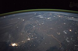 Təhlükəsizlik işıqları ilə işıqlandırılmış olan Pakistan — Hindistan sərhədi beynəlxalq sərhədlərin gecələr belə göründüyü dünyada nadir yerlərdən biridir.
