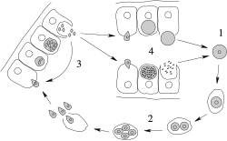 Plazmodilərincinsi yolla çoxalması isə ağcaqanadın orqanizmində baş verir. Burada hamontlar inkişaf edərək qametlərə çevrilir. Qametlər isə birləşərək diploid ziqot əmələ gətirir. Ziqotun ətrafında membran əmələ gəldikdən sonra, o sistaya çevrilir, daha dəqiq desək, oosistaya çevrilir. Sonra oosistalar meyoz bölünmə üsulu ilə bölünür və hər oosistanın içində haploid sporozoit formalaşır. Haploid sporozoitlər invaziv formadır, yəni ağcaqanad insanın dərisi üzərinə qonur, qanı sorur, qan sorarkən həmin invaziv formalar zədələnmiş nahiyəyə düşür və sikl yenidən başlanır. Toksoplazmozun törədicisi də mürəkkəb inkişaf sikli keçir. Siklin bir hissəsi pişiyin, digər hissəsi ayrı bir məməlinin, üçüncü hissəsi isə insan orqanizmində keçir.