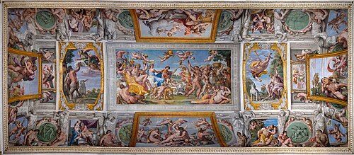 • Mərkəzi sıra (soldan sağa): "Pan və Diana", "Baxxus və Ariadnenin triumfu" və "Merkuri və Paris". Sol aşağı tərəfdən saat oxu istiqamətinin əksinə tavan ətrafında səhnələr aşağıdakı kimi qruplaşdırılmışdır: