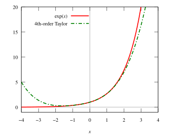 Mənşə ətrafında y = e x {\displaystyle y=e^{x}} {\displaystyle y=e^{x}} eksponent funksiyası (bütöv qırmızı xətt) və qarşılığı olan dördüncü dərəcədən Teylor polinomu (parçalı yaşıl xətt)