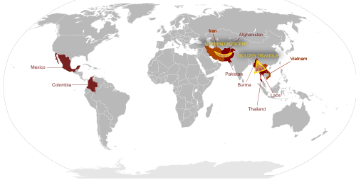 Birləşmiş Millətlər Təşkilatının Narkotiklər və Cinayətkarlıq İdarəsi (BMTNC), son 10 ildə heroin istehsalının qiymətləndirmələri, əsas qaynaq sahələrində əhəmiyyətli dəyişikliklər göstərir. 1991-ci ildə Əfqanıstan, dünyada tiryək istehsalında lider olan Myanmarı üstələyərək 1.782 metrik ton (ABŞ Dövlət Departamentinin hesablamalarına görə) gəlir gətirən əsas tiryək istehsalçısıdır. Myanmadan heroin istehsalının azalması bir neçə ildir əlverişsiz böyüməkdə olan şəraitin və yeni hökumətin zorla aradan qaldırılması siyasətinin nəticəsidir. Eyni vaxt çərçivəsində Əfqanıstanda eroin istehsalı artdı və 2001-ci ildə iddia edilən Talibanın heroin istehsalına qarşı fətvası nəticəsində nəzərəçarpacaq dərəcədə azaldı. İndi Əfqanıstan dünyada qeyri-dərman tərkibli tiryəkin 90% -dən çoxunu istehsal edir. Narkotiklərlə yanaşı, Əfqanıstan həmçinin dünyanın ən böyük həşiş istehsalçısıdır.