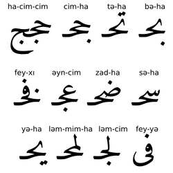 - ث (sə), ع (əyn), ض (zad), ظ (za) ərəb dildən alınmalarda işlənilir: مثال misal, عالم aləm, ضرر zərar, ظفر zəfər